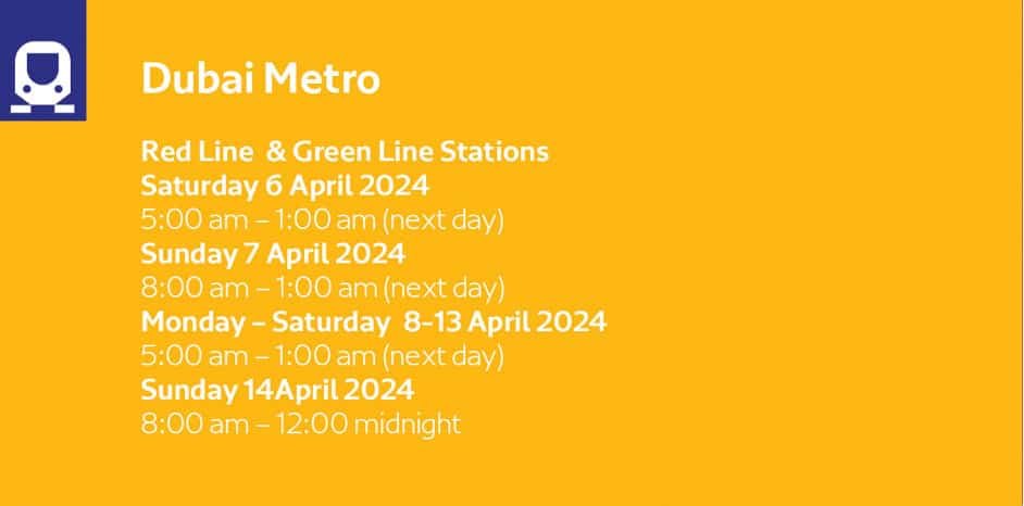 The RTA has announced the timings for public transport on the occasion of Eid Al Fitr 2024, as follows: